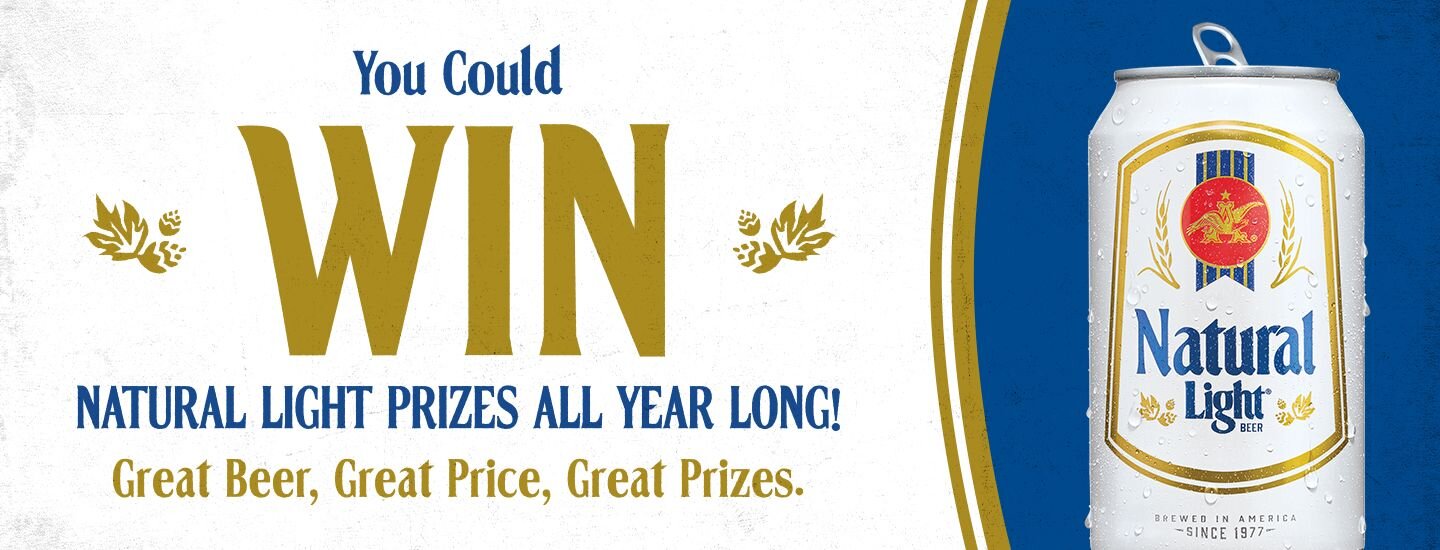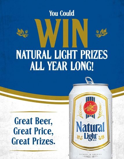 GREAT BEER, GREAT PRICE, GREAT PRIZES SWEEPSTAKES No Purchase Necessary. Open to US residents 21+. Begins on 1/5/2026 and ends on 12/31/2026. Multiple entry periods. Visit https://www.naturallight.com/GreatPrizes for free entry, entry deadlines, and Official Rules. Message and data rates may apply., Void where prohibited. Enjoy Responsibly © 2026 Anheuser-Busch, Natural Light® Beer, St. Louis, MO